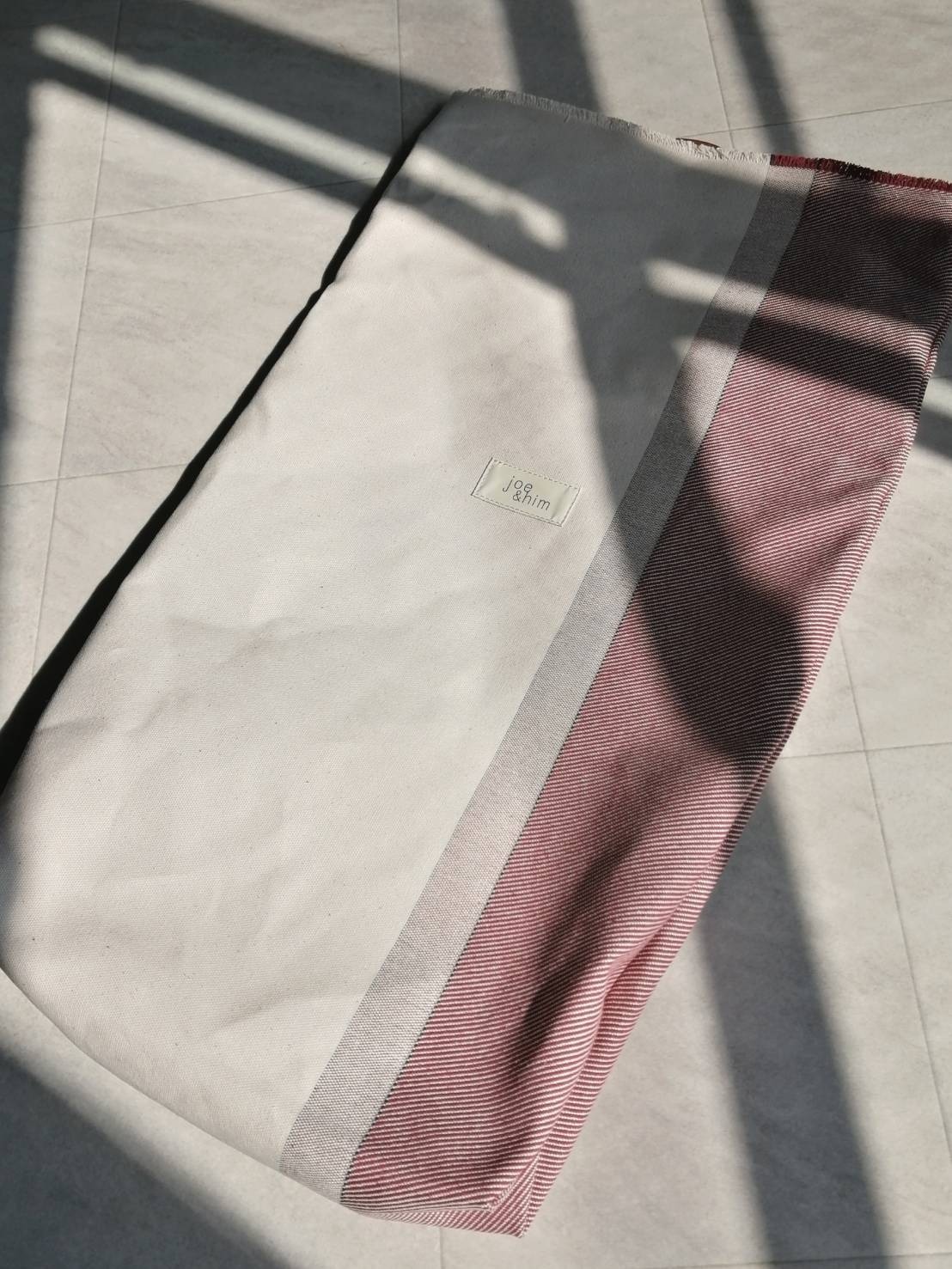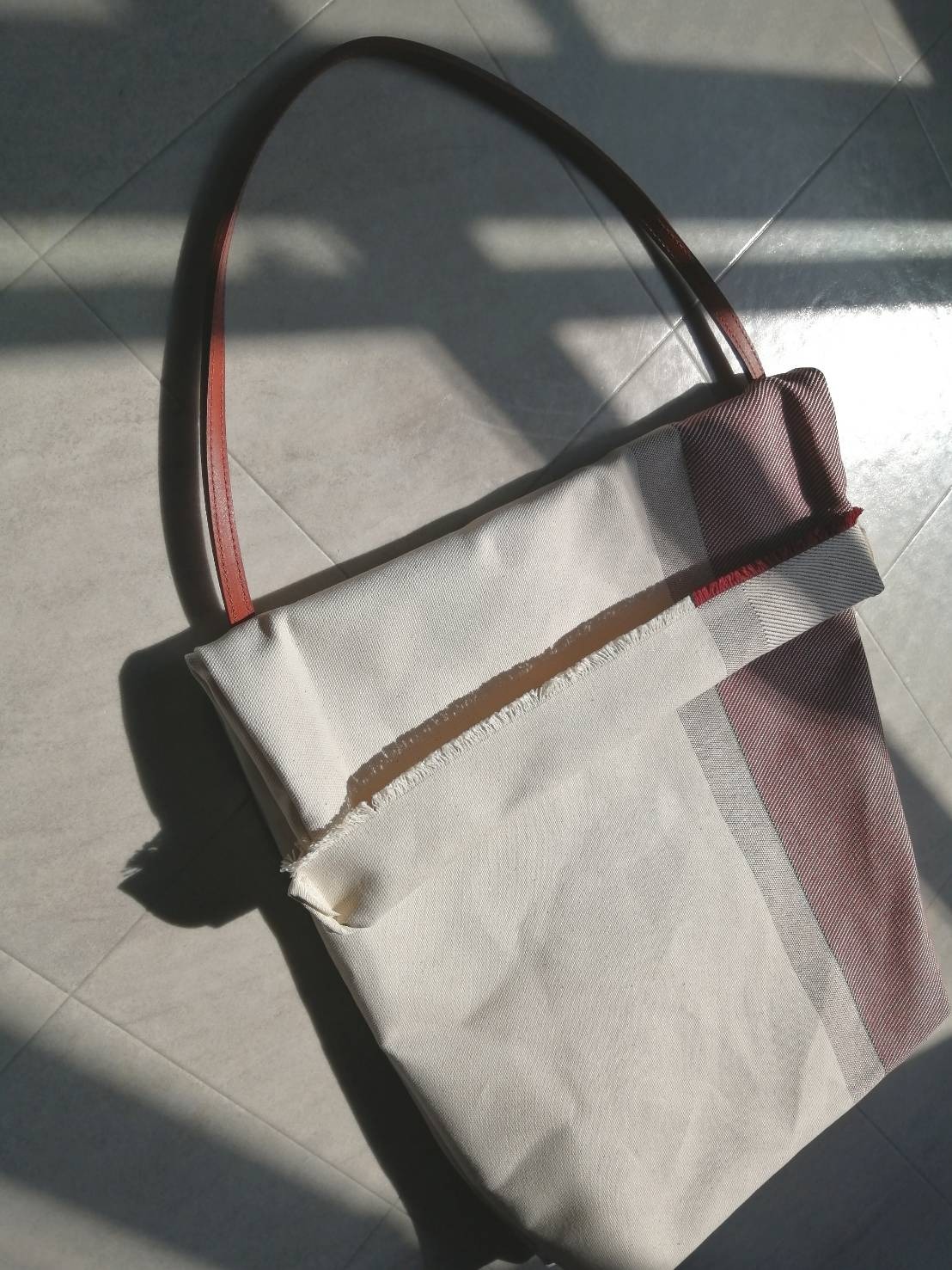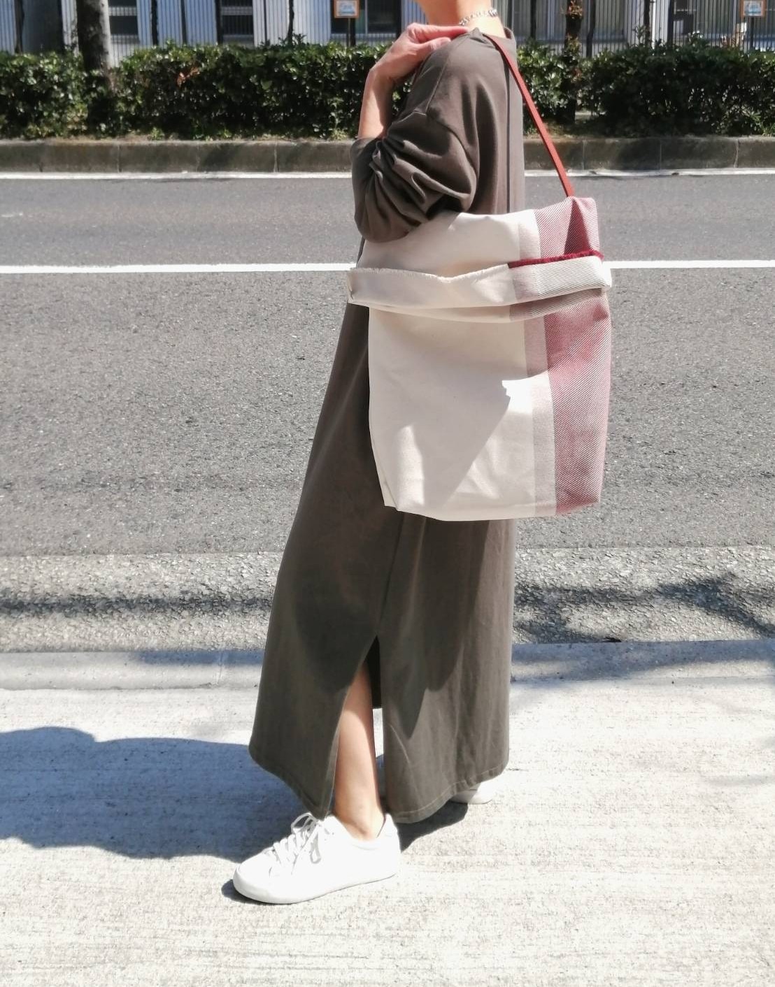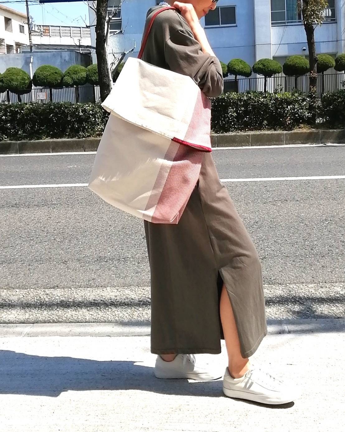 コットンキャンバス素材のショルダーバッグです。袋状のバッグとハンドルはレザーのシンプルな仕上がり。シンプルゆえにレザーハンドルとキャンバス生地の柄とがアクセントになっています。